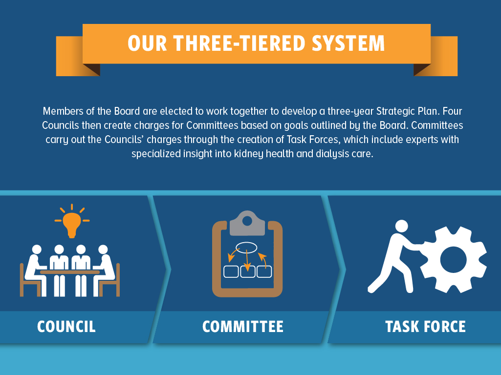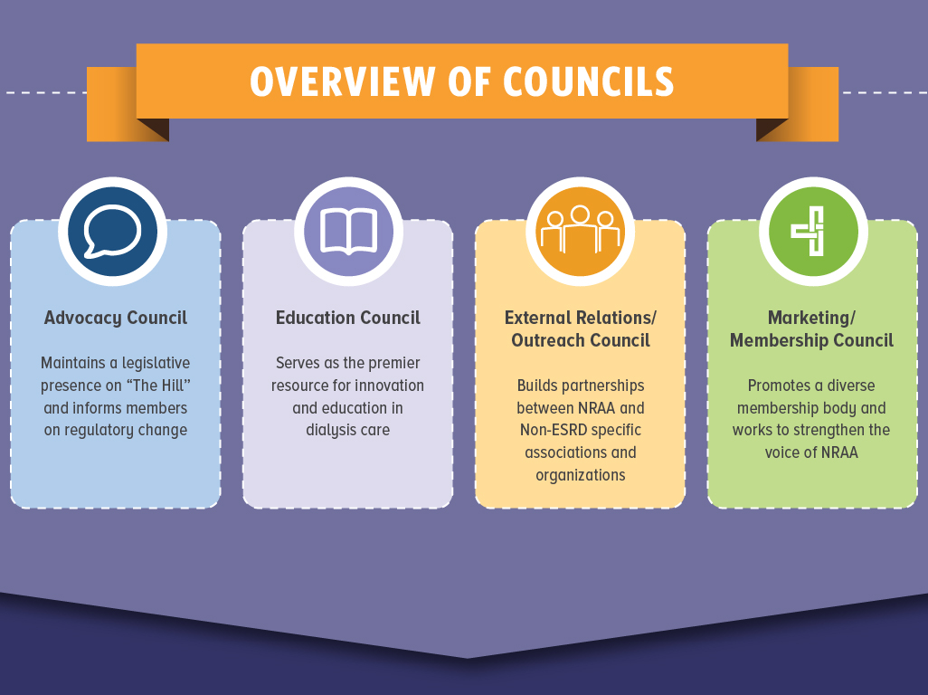 Made up of Councils, Committees and specialized Task Forces, this three-tiered system encourages members to actively work together to carry out the mission and vision of NRAA, and advocate progress in the kidney care community. NRAA members don't just create positive change within the independent dialysis community - they lay the foundation for the future of kidney health and dialysis care. Do you have the knowledge, experience and expertise to join our cause? If so, we want YOU!
