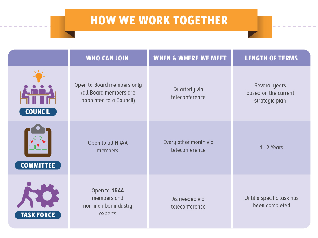 Every one of our members plays a crucial role in the success of NRAA. By joining a Committee or Task Force, you have the opportunity to: